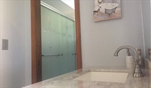Master Bedroom En Suite Bathroom with Stand Alone Shower, Sink and Toilet | Large shower and washroom door leading to pool area |