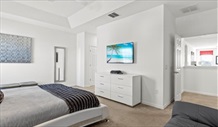 Master Suite Bedroom sleeps King | The master suite of the home is a huge bedroom housing a king bed. There is also a leather sofa, white double drawer unit and a wall mounted flat screen 50” Smart TV. The built in wardrobe is massive providing more than enough storage space for all clothes and suitcases. |