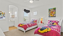 Magic Kingdom Themed Bedroom Bedroom sleeps Twin | The final themed bedroom is our Magic Kingdom room with a full wall hand painted mural showing Mickey, Minnie, Goofy, Donald and Pluto on Main Street USA. As well as Mickey Mouse window dressings and a large character print there is Mickey themed bedding. As well as a built in wardrobe there is a white double chest drawer unit and a wall mounted flat screen 42” Smart TV. |