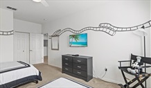 Hollywood Studios Themed Bedroom Bedroom sleeps Double | The Hollywood Studios Themed bedroom seems to be the favourite of the themed rooms from our guest feedback. This comprises two double/full beds so if required can sleep 4 people. Another hand painted mural depicting Mickey Mouse as a movie director and Goofy as a cameraman celebrating how "It all started with a mouse" in black and white adorns the main wall above the beds. A film reel runs around the whole room and the black bedside cabinets, drawer unit and even a Directors Chair really give the room a "classic" feel. There is also a wall mounted flat screen 42” Smart TV. |