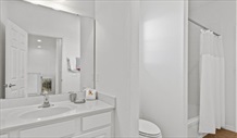 Downstairs Bathroom Bathroom with Bath, Overhead Shower, Sink and Toilet | The downstairs bathroom is the only one shared by two bedrooms being the king master bedroom and the twin Animal Kingdom themed bedroom but this is a prefect set up for one family should there be multiple families sharing the home. |
