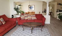 Living Room | The living areas are open plan with the living room, dining room and kitchen flowing into one. The living room area overlooks the swimming pool and lake beyond. The swimming pool deck is accessible from a large picture sliding patio door. It contains ample seating on our over-sized sofas to admire the view outside, play games or watch TV. The TV packages include hundreds of free streamed live channels and on demand programming. There is also a DVD player to watch your own movies and a selection of movies, books and board games are available. |