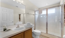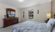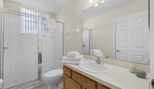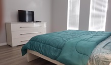 Queen Bedroom with en-suite Bedroom sleeps Queen | Third Master - The third master bedroom, situated upstairs, provides a comfortable queen-size bed along with ample storage space thanks to a sliding closet. This room is also equipped with a flat-screen TV for your entertainment and relaxation. Additionally, it includes an ensuite bathroom that features a spacious shower cubicle, a sink, and a toilet, ensuring both privacy and convenience during your stay. |