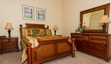 Master Bedroom with Ensuite | The master suite has high cathedral ceiling a ceiling fan, large walk in closet. It is furnished with a Queen Size bed and matching furniture which includes chest of drawers, and bedside cabinets. There is a cable television complete with an integral DVD player in the room. The en-suite bathroom has a large walk in shower, WC and wash hand basin and has direct access to the pool area. |