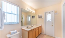 Master Bedroom & En-Suite Bathroom Bedroom sleeps Queen | The Master Bedroom has a queen size bed with a Sealy Posturepedic Pillow Top mattress, two nightstands, full size dresser with mirror, radio alarm clock, a 21" widescreen LCD remote control colour cable TV and telephone. The en-suite bathroom has a shower, toilet and twin hand basins. A hair dryer is provided in the bathroom. There is a walk in closet in the bathroom in which there is digital safe for guests use. A door leads out from the bathroom on to the pool deck. The floor in the bedroom is carpeted and is finished in ceramic floor tiles in the bathroom. |