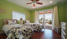 First floor Guest Bedroom #1 | Features twin beds, overhead ceiling fans, tile floor, double closet with separate set of draws, direct access to the front balcony with views of the tropical canal. |