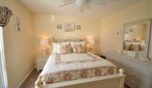 Another delightfully decorated room, the second master enjoys a Queen Size bed, again with pillow top mattress and this time a 32” Flat Screen TV and DVD player. Again there is a paddle ceiling fan for your additional comfort. The en-suite is a wheel in shower room, with an accessible single basin and vanity unit with WC.