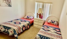 | First Twin bedroom Bedroom sleeps Twin | Twin beds Night stand , dressing table , 32 inch flat screen TV ceiling fan with plenty of room for a cot if you're travelling with an infant. |