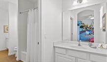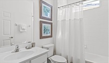Downstairs Bathroom Bathroom with Bath, Overhead Shower, Sink and Toilet | The downstairs bathroom is the only one shared by two bedrooms being the king master bedroom and the twin Animal Kingdom themed bedroom but this is a prefect set up for one family should there be multiple families sharing the home. |