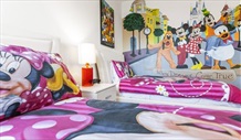 Magic Kingdom Themed Bedroom Bedroom sleeps Twin | The final themed bedroom is our Magic Kingdom room with a full wall hand painted mural showing Mickey, Minnie, Goofy, Donald and Pluto on Main Street USA. As well as Mickey Mouse window dressings and a large character print there is Mickey themed bedding. As well as a built in wardrobe there is a white double chest drawer unit and a wall mounted flat screen 42” Smart TV. |