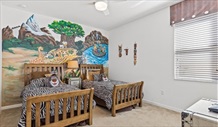 Animal Kingdom Themed Bedroom Bedroom sleeps Twin | The Animal Kingdom themed bedroom is a twin room on the ground floor. A full wall painted mural depicting Disney's Animal Kingdom provides the perfect backdrop for the safari luggage furniture, wooden beds and animal print bedspreads. There is a built in wardrobe and a wall mounted flat screen 42” Smart TV. |
