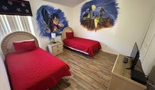 Why You’ll Love This Home Two Master Suites Each features an ensuite bathroom and direct access to the pool—perfect for relaxing mornings or evening swims. Queen Bedroom with Ensuite Ideal for added privacy and comfort. Themed Twin Bedrooms Step into the magic with Harry Potter and Daisy Duck murals, extending the Disney experience right into your home. Fully Equipped Kitchen & Dining Areas Cook with ease and enjoy meals indoors or dine poolside with a beautiful outdoor setup. Game Room Entertainment Have fun with a pool table, and foosball, all surrounded by custom Simpsons-themed murals! Private Pool & Spa Relax in your own secluded oasis, surrounded by lush greenery for maximum privacy. Pool & spa heating available for an additional fee. Smart TVs in Every Room Stream your favorite shows and movies with ease. Spacious Living Room Perfect for movie nights on a large flat-screen TV. Accessibility-Friendly ✔ Single-story home ✔ Minimal steps at the entrance Have questions or specific needs? Just ask—we’re happy to help! BBQ rentals available to make your stay even more memorable! Book now and experience a magical Orlando getaway just minutes from Disney! Child Safety Fence on pool deck