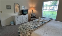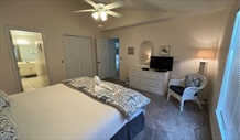 | Bedroom 2 Bedroom sleeps Queen | Queen Bed. 2 Night stands with lamps. Walk-in Closet. Chair. Ceiling Fan. |