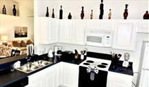 The villa is located at Eagle Pointe a warm and family-friendly residential vacation home community located south of Orlando, just off US 192, the major highway that leads directly to Disney! The lounge provides formal dining for 6 guests along with comfy sofas, wall mounted 40" cable TV with multiple channels, DVD and video players, stereo music centre plus a library of DVD's, CD's, videos and books. An open plan kitchen/diner is fully equipped for your use with oven, hob, fridge/freezer/ice maker, dishwasher, microwave, toaster, coffee maker, waste-disposal, washer and dryer. Everything and chef would need. Your first master bedroom features a King sized suite with cable TV, en-suite bathroom, twin vanity unit, tub, shower and pool access. The second master bedroom features a Queen sized suite with cable TV, en-suite bathroom with large walk in shower, vanity unit and pool access. The third bedroom has twin beds,cable TV and an adjacent bathroom with shower tub and vanity unit. Outside we have a private pool with an extended pool deck and with chairs and sun loungers for your use. Free use of the Weber Gas BBQ, great for lunch or dinner on the extended pool deckand faces the conservation area, to add additional privacy. A large sundeck and pool area offers you privacy whilst the covered lanai provides shade for your outside dining. The large private pool with lighting can be heated during winter months and luxury pool furniture invites total relaxation. NO SMOKING and NO PETS allowed within the villa