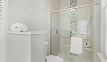 | Guest Bathroom Bathroom with Bath, Overhead Shower, Sink and Toilet | Over-bath shower, single vanity and toilet |