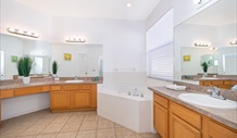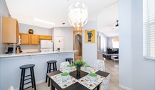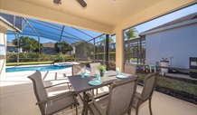 | Pool Area | The pool deck has a private pool and spa, with lanai for covered outdoor dining and plenty of space for the whole family to be able to relax together. The spacious L-shaped pool deck features a swimming pool and adjoining spa, designed for ultimate relaxation and enjoyment. Surrounding the pool are five comfortable sun loungers, perfect for soaking up the Florida sun. A dedicated area under the covered lanai with a table and chairs provides an ideal setting for alfresco dining, allowing guests to enjoy meals outdoors in a serene and inviting atmosphere. The layout ensures ample space for both leisure and socializing, making it a perfect spot for families and groups alike. *Pool & spa heating is optional dependent on the time of year and recommended during the months October to April. If required it is charged at £29 per day. |