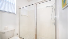 | Queen Bedroom with en-suite Bedroom sleeps Queen | Third Master - The third master bedroom, situated upstairs, provides a comfortable queen-size bed along with ample storage space thanks to a sliding closet. This room is also equipped with a flat-screen TV for your entertainment and relaxation. Additionally, it includes an ensuite bathroom that features a spacious shower cubicle, a sink, and a toilet, ensuring both privacy and convenience during your stay. |