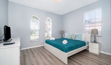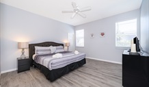 | Master Bedroom with en-suite Bedroom sleeps King | Master Suite - The master bedroom is designed for comfort and space, featuring a king-size bed that promises restful nights. A large sliding closet offers ample storage, while a TV provides entertainment convenience. A door leads directly to the pool deck, creating a seamless indoor-outdoor living experience. The en-suite bathroom includes a corner bathtub for relaxing soaks, a separate shower cubicle, two single sinks, and a toilet, ensuring both functionality and privacy. |