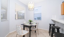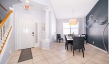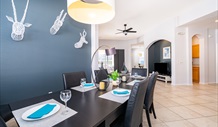 | Living Areas | This contemporary two-story home features five spacious bedrooms and a modern keyless entry system for added convenience and security. The bright and airy formal living room perfectly balances stylish decor with relaxed comfort, creating an inviting space ideal for both entertaining and everyday living. Natural light floods the room, highlighting the clean lines and sophisticated finishes throughout the home. Immediately inside the front door to the left is the formal dining area, featuring a table that comfortably seats eight people. Directly opposite the entrance is the contemporary family lounge, which includes a large L-shaped sofa, patio doors leading to the pool deck, and a large flatscreen TV with a DVD player. To the right of the family lounge is the open-plan kitchen, fully equipped with everything needed to prepare delicious family meals. Adjacent to the kitchen, the breakfast table with four chairs provides a convenient spot for snacks and casual drinks. |