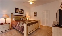 Master Bedroom with En-suite Bedroom sleeps King | Luxuriously furnished bedroom complete with American King Size bed, 32" HDTV and a walk in wardrobe. A separate access door leads directly onto pool deck. Bedside tables and a large dressing table ensure plenty of storage space. An en-suite bathroom with his and hers vanity basin, whirlpool bath and separate shower area and WC, a hair dryer is also provided. A radio / alarm clock and wireless router is also located in the bedroom. |