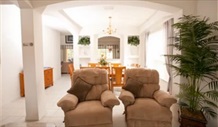 Accommodation | Situated on the ground floor, the master bedroom is the ultimate in luxury with king size bed and spacious walk in wardrobe. It also features an en-suite bathroom with double shower and corner tub. On the second floor you will find another king-size bedroom with walk in wardrobe and en-suite facilities. Also on the second floor are two queen-size bedrooms which share a bathroom and two twin rooms, sharing the 4th bathroom. All rooms are beautifully decorated with handpicked furnishings and all have televisions. All bedrooms have air conditioning as well as ceiling fans for your added comfort. The den is also equipped with telephone, television and Wi-Fi Internet connection. For larger parties, you are able to convert the den into a bedroom, with the queen-size sofa-bed. |