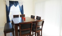 | Dining Area | On those rare occasions when you want to dine inside or for breakfasts before setting out for the day there is a large family dining table with 6 seats and a further large bench seat. The table is further extendable to a full 6 foot square and so there is plenty of space. Next to this there is a small breakfast bar area with 2 bar stools for breakfast or for chatting to the chef while he/she works. A sliding glass patio door opens out from the dining area onto a small covered veranda leading in turn to the rear steps to the downstairs pool and patio area. |